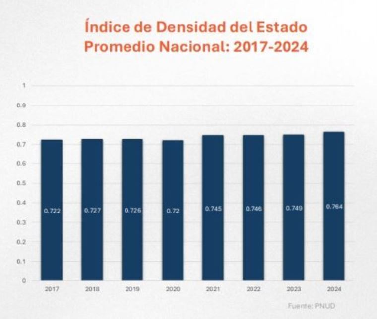 El informe del PNUD también actualiza al 2024, el Índice de Densidad del Estado (IDE), el cual mide la presencia de servicios públicos en cuatro dimensiones: salud, educación, agua y saneamiento, y electricidad a nivel distrital.