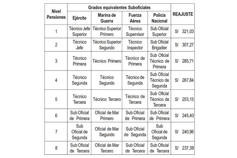 El segundo reajuste de pensiones del año 2025, se efectuará a partir del mes de julio, y el aumento de los montos se realizará según el grado del personal beneficiario. En el caso de los oficiales, el beneficio oscila entre S/ 265.57 y S/ 1028.76. Mientras que, para los suboficiales y técnicos, entre S/ 237.38 y S/ 321.03.