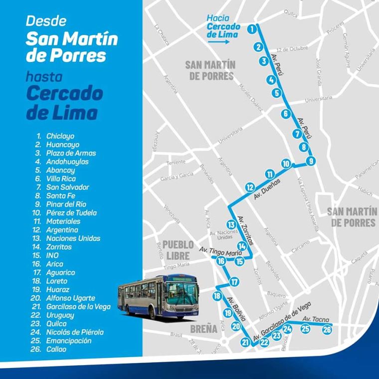 Este nuevo servicio recorrerá importantes vías como Garcilaso de la Vega, Venezuela, Arica, Óscar R. Benavides y Nicolás Dueñas, entre otras, con un total de 22 paraderos en dirección a San Martín de Porres y 26 en el sentido contrario.