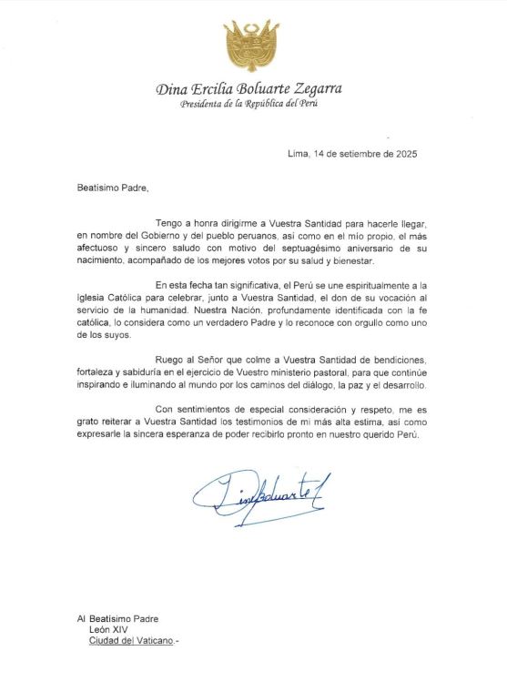 "En esta fecha tan significativa, el Perú se une espiritualmente a la iglesia Católica para celebrar, junto a Vuestra Santidad, el don de su vocación al servicio de la humanidad. Nuestra nación, profundamente identificada con la fe católica, lo considera como un verdadero Padre, y lo reconoce con orgullo como uno de los suyos", agrega Boluarte Zegarra en su saludo.