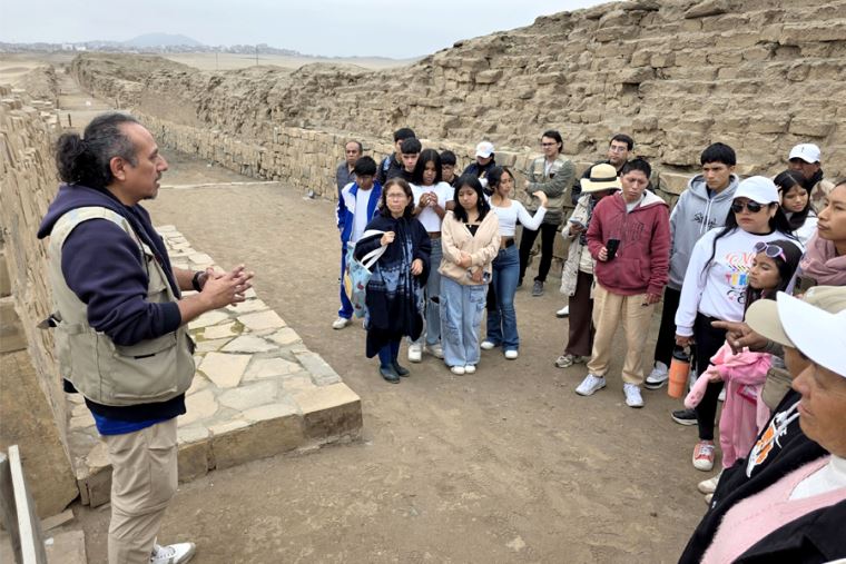 Posteriormente, guiados por un arqueólogo, los asistentes recorrieron diferentes espacios del monumento, donde pudieron apreciar la impresionante arquitectura de los antiguos habitantes Ychsma e incas. En particular, visitaron una de las dieciséis pirámides con rampa que posee Pachacamac, estructuras que fueron ocupadas por líderes o gobernantes y que cumplían funciones religiosas, ceremoniales, civiles, políticas y administrativas.