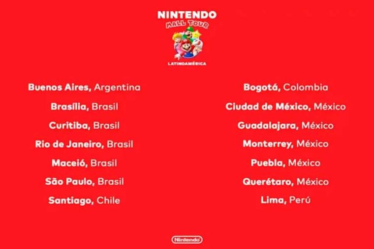 En Perú, el Nintendo Mall Tour Latinoamérica estará presente en Lima, del 22 al 30 de noviembre, en el Jockey Plaza, ofreciendo a los fanáticos la oportunidad de probar demos de juegos para Nintendo Switch y Nintendo Switch 2, incluyendo títulos como Super Mario Galaxy, Mario Kart World y Donkey Kong Bananza.