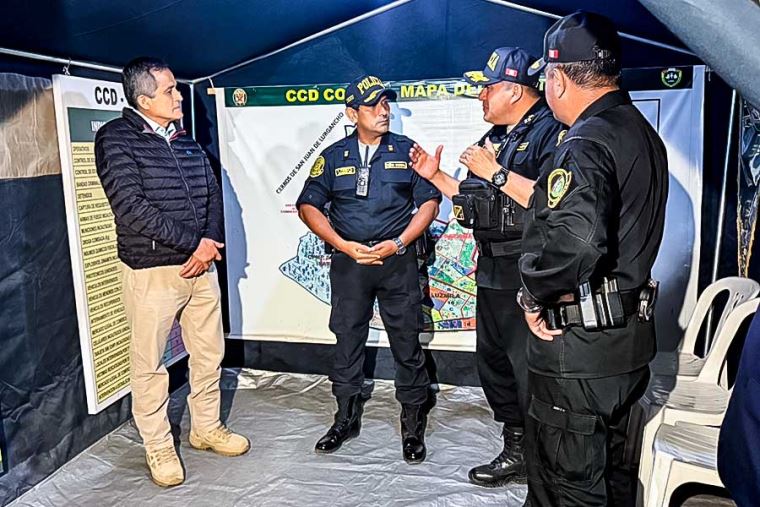Posteriormente, el viceministro Zapata Morante se dirigió hacia el puesto de Comando de Control de Comas para verificar las intervenciones registradas en esa jurisdicción, junto al comandante general de la Policía Nacional del Perú, general de Policía Óscar Arriola.