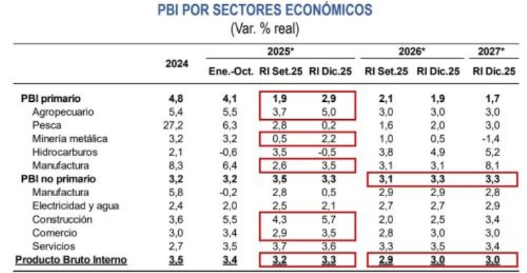 También indicó que, para el siguiente año, el PBI primario (agro, pesca, minería, hidrocarburos) crecería 1.9% y el PBI no primario (manufactura, construcción, comercio, servicios) se expandiría 3.3%.