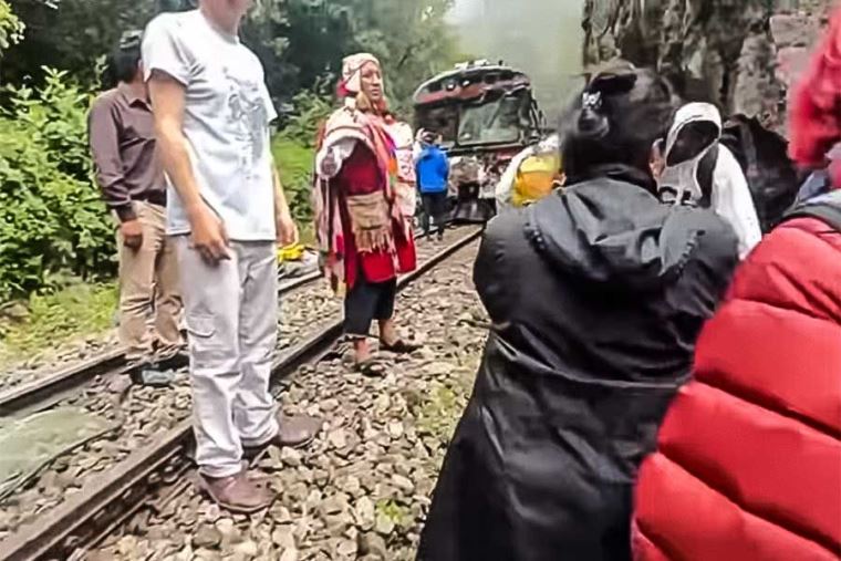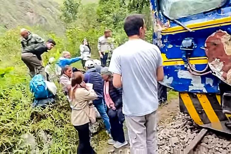 Imágenes difundidas por usuarios en sus redes sociales, muestran a turistas nacionales y extranjeros a un costado de la vía férrea, a la espera de que llegue la ayuda médica.