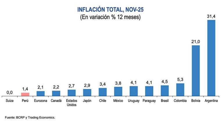 Asimismo, manifestó que el país registra la tasa de inflación más baja de la región y un nivel inferior al observado en las principales economías desarrolladas (Eurozona, Canadá, Estados Unidos), de acuerdo con información a noviembre de 2025.