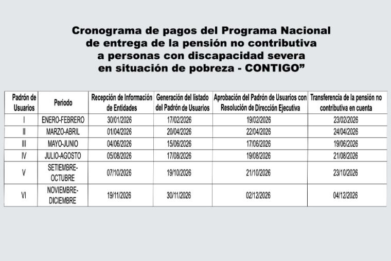 La resolución establece las fechas clave para la recepción de información de las entidades competentes, la generación y aprobación del Padrón de Usuarios, así como la transferencia bimestral de la pensión no contributiva en cuenta, garantizando previsibilidad y orden en la ejecución del beneficio social durante todo el año 2026. El cronograma contempla seis periodos: enero-febrero, marzo-abril, mayo-junio, julio-agosto, setiembre-octubre y noviembre-diciembre, con transferencias que se realizarán entre febrero y diciembre del próximo año.