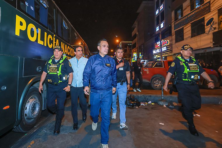 Durante la jornada, llegó hasta la cuadra 25 de la avenida José Granda, donde la Policía intervino una vivienda y halló cartuchos de dinamita, un arma de fuego, municiones y equipos celulares, además de detener a dos personas. Luego inspeccionó a pie las avenidas Habich, Panamericana Norte y Universitaria, donde efectivos de la Policía y las Fuerzas Armadas ejecutaban un megaoperativo de control territorial.
