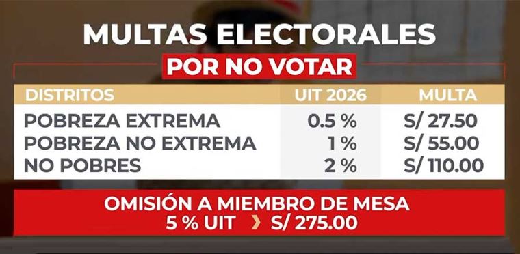 • La multa por votar en un distrito de extrema pobreza es el 0.5% de la UIT, S/ 27.50