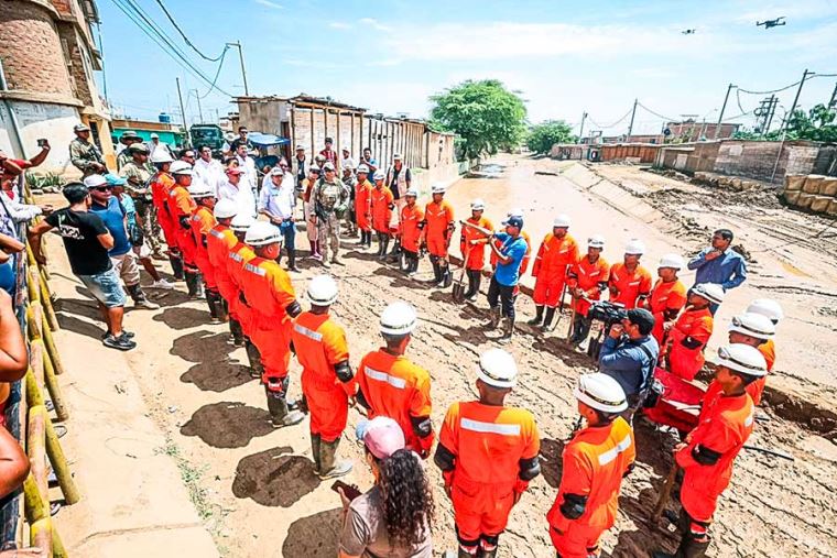 Posteriormente, se trasladó al dren Primero de Mayo, en Máncora, uno de los puntos más afectados por la emergencia. En esta zona, las lluvias provocaron el deslizamiento de lodo y piedras que bloquearon pistas y veredas, además de afectar viviendas y poner en riesgo a decenas de familias.