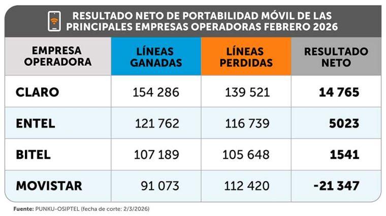 De las cuatro principales empresas operadoras del mercado, Claro, Entel y Bitel alcanzaron resultados netos positivos en febrero, es decir, ganaron más líneas móviles de las que perdieron. Claro consiguió un saldo neto positivo de 14 765 líneas, mientras que Entel y Bitel obtuvieron resultados netos positivos de 5023 y 1541 líneas, respectivamente.