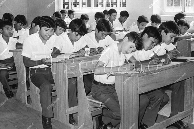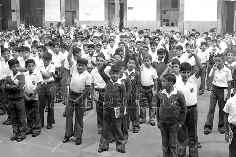 Lima - 13 abril 1981 / Correctamente uniformados asisten a clases los alumnos de la Gran Unidad Escolar Melitón Carvajal. Foto: Archivo Histórico de El Peruano / José Risco