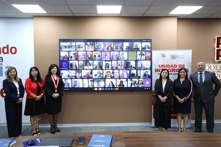 En la reunión virtual, también participó la gerenta general del Poder Judicial, Claudett Delgado Llanos, quien tuvo a su cargo las palabras de bienvenida a los participantes, y la funcionaria responsable de la Unidad de Integridad del Poder Judicial, Elizenda Quispe Castillo.