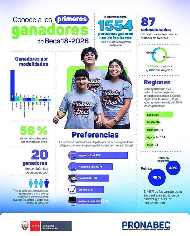 De acuerdo a los resultados publicados por el Programa Nacional de Becas y Crédito Educativo (Pronabec) del Ministerio de Educación, Lima, Cusco, Ayacucho, Huánuco y Puno son las regiones con más seleccionados.