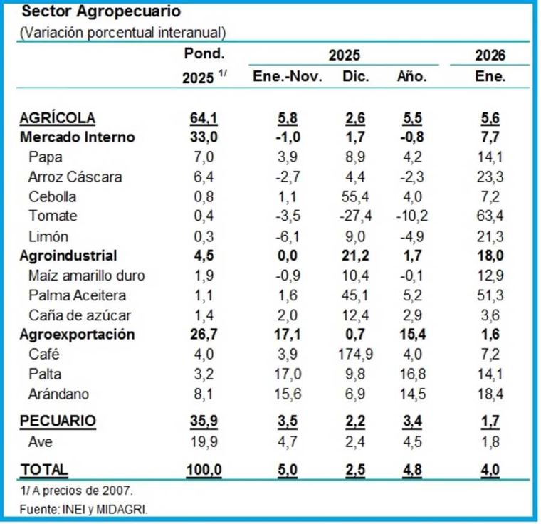 En enero, la producción agrícola orientada al mercado interno aumentó en 7.7%. Ello respondió a una mayor producción de papa, por mayores siembras. El crecimiento de arroz y cebolla se dio por un efecto base.