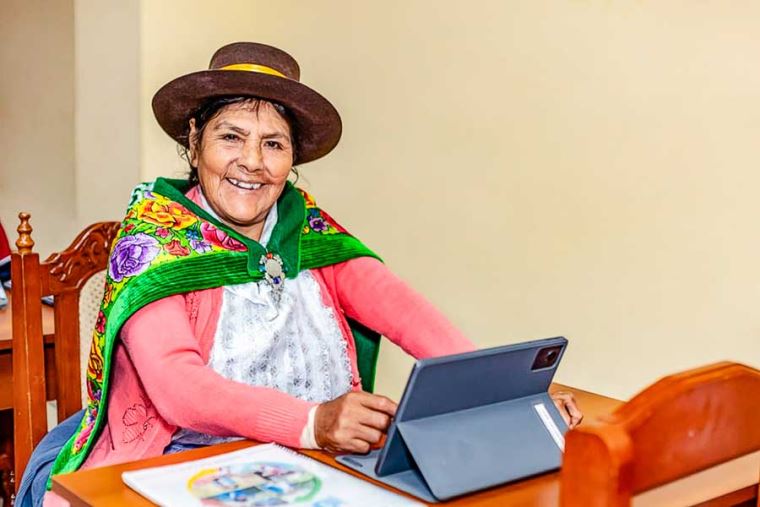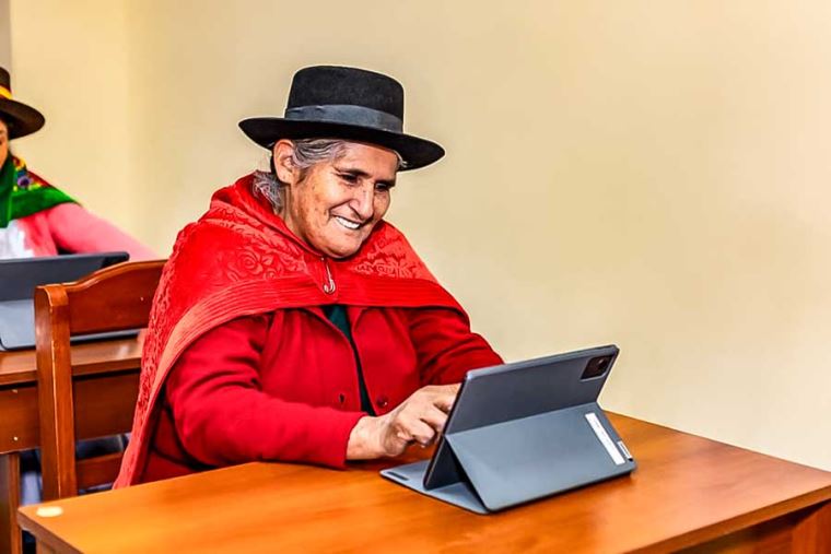 En Julcamarca, ubicado a 3418 m s. n. m., destaca la participación de Perpetua Rodríguez (78), quien se familiariza con el uso de una tablet como parte de esta experiencia formativa, impulsada por su gobierno local en coordinación con Pensión 65, en el marco de la promoción de una vejez digna.