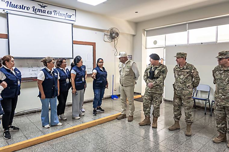 En la IE 1070 Melitón Carbajal, en Lince, por ejemplo, se dispuso un equipo inicial de siete efectivos con refuerzos adicionales, mientras que en el colegio FAP Manuel Polo Jiménez, de Surco, se desplegaron 23 efectivos de la Fuerza Aérea, en coordinación con la Policía Nacional, que mantiene el control perimétrico.