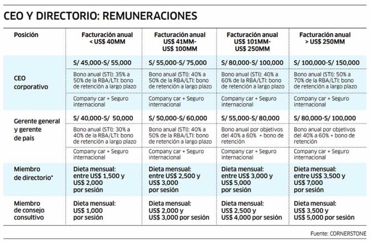 De acuerdo con el informe, el promedio de la remuneración bruta mensual de un director ejecutivo (CEO) para una empresa familiar, con una facturación de entre 20 millones y 40 millones de dólares, es de 50,000 soles.