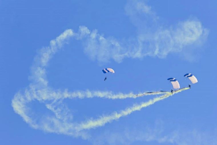Posteriormente, cinco aeronaves Game Bird de la Escuadrilla Acrobática Bicolor FAP realizaron una destacada presentación aérea, seguida por el salto de 50 paracaidistas, quienes ofrecieron un espectáculo de precisión y destreza.