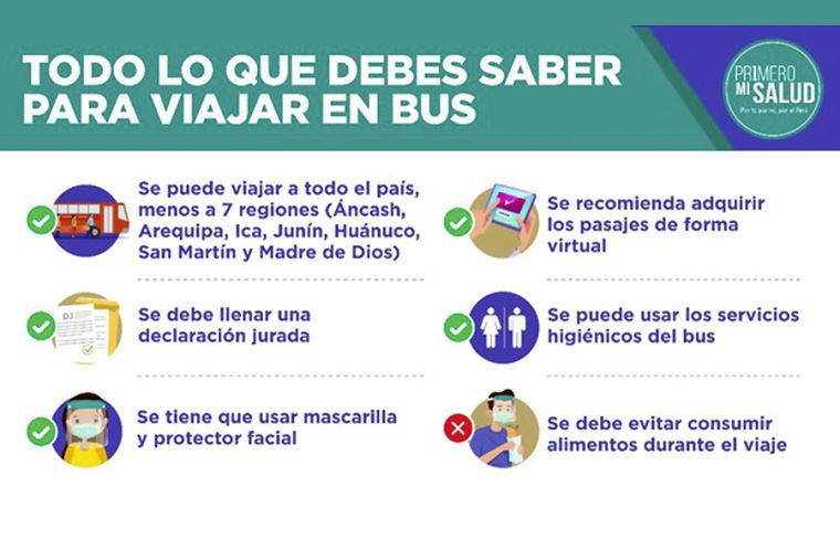 Se puede realizar viajes en todo el país, menos en las siete regiones: Áncash, Arequipa, Ica, Junín, Huánuco, San Martín y Madre de Dios. Los buses no podrán recoger ni dejar pasajeros en estas localidades.