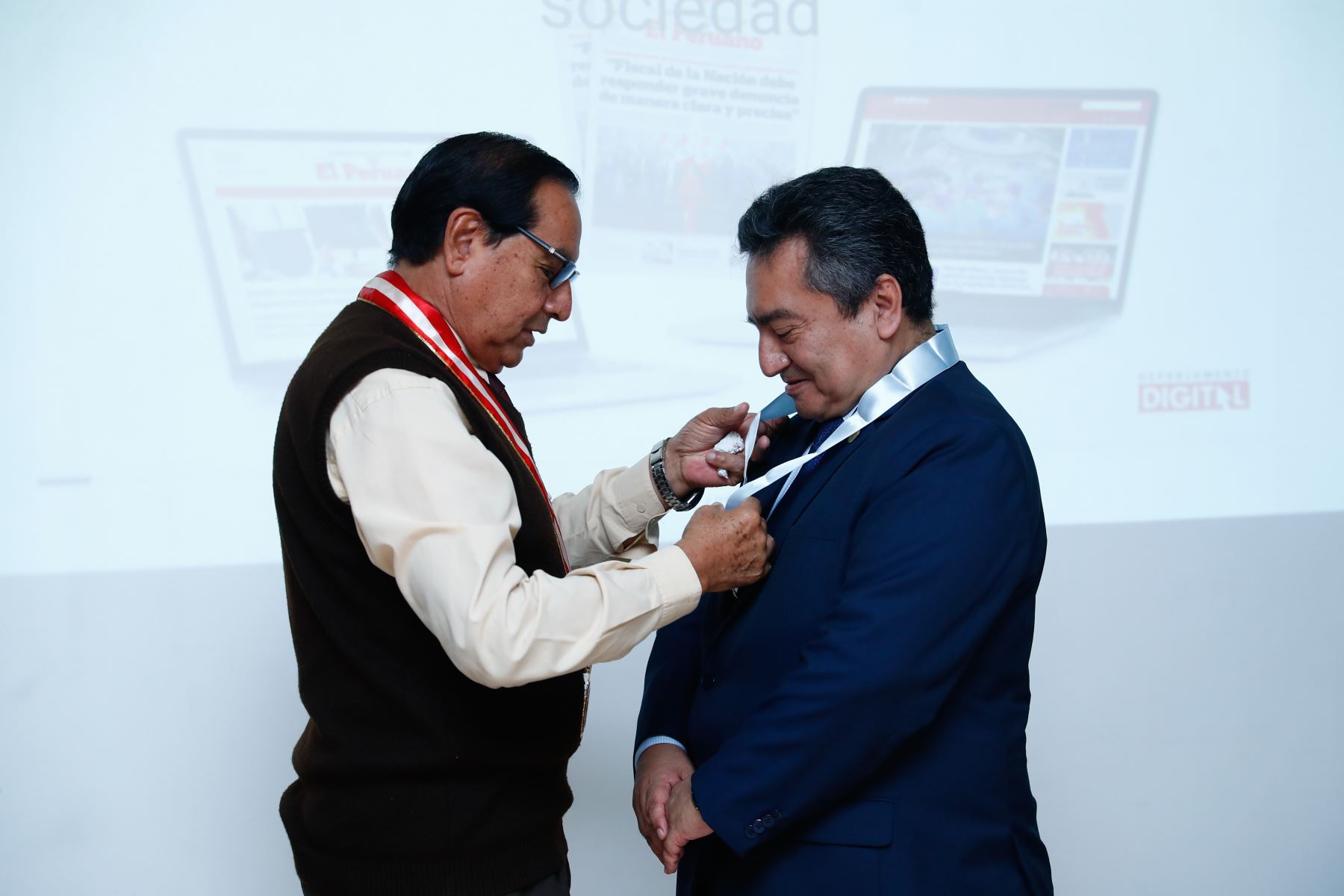 En ese sentido, entregó diplomas de reconocimiento y la medalla oficial de la Universidad Nacional Pedro Ruiz Gallo, máxima distinción, al Diario Oficial El Peruano por los 200 años de su fundación. Félix Paz y Ricardo Montero recibieron los distintivos de las autoridades académicas.