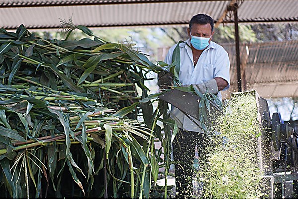 Cada cabra de raza Saanen produce entre cuatro litros de leche a diarios. Además, cría ovejas Dorper. La leche la venden y hacen queso artesanal “con todos los cuidados de bioseguridad en nuestra sala de ordeño”, enfatiza el empresario sullanero mientras tritura el pasto que alista para alimentar al ganado.