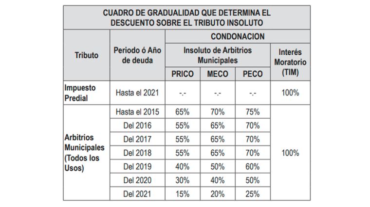 De acuerdo con la norma, esta condonación se realiza en materia de impuesto predial, multas tributarias, arbitrios de limpieza pública; arbitrios de parques y jardines; arbitrios de serenazgo; así como a las deudas que se encuentran con convenio de fraccionamiento.