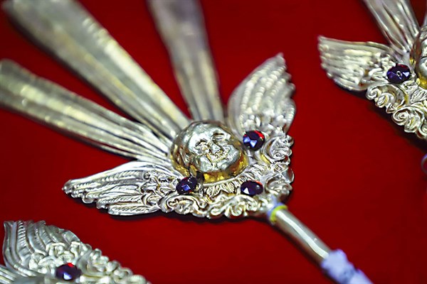 “Son sudarios históricos”, subraya Airton. “La primera [granate] fue donada el 44 por la fábrica La Estrella, es un terciopelo francés bordado íntegramente en hilos de oro. La segunda, terciopelo verde oscuro, es de similar bordado”. Destaca luego de ambas figuras el penúltimo sudario por los 300 años de la declaratoria del Taytacha como Patrón Jurado de Cusco.