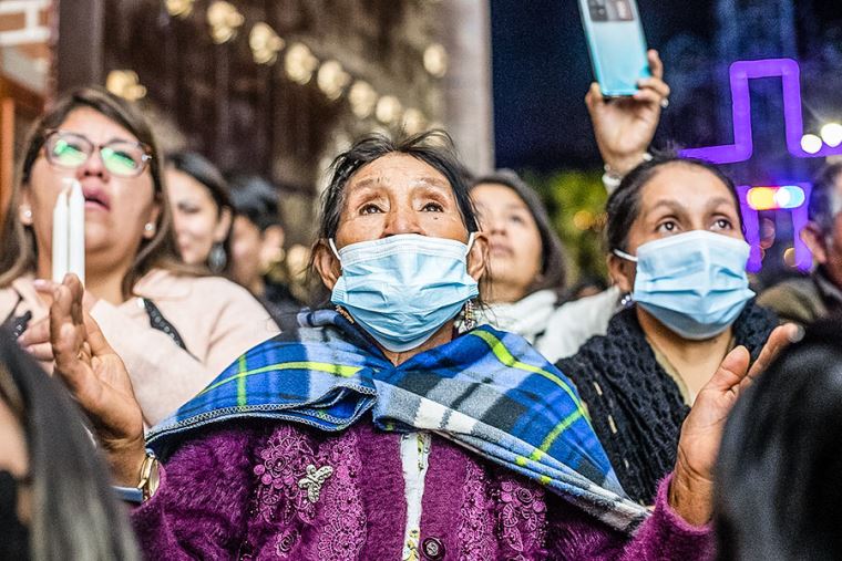 Doña Miriam Salcedo, que aquí ha presenciado tantas procesiones del Señor de la Resurrección, se extraña de que este 2022, que retorna la tradición, no se vea a los campesinos quienes siempre venían desde los pueblos y anexos para esta festividad a quitarse las andas cumpliendo promesas. Ellos, que saben de cargar sacos de papas, habas, tienen la técnica correcta para cargar la imagen y el Cristo avanza ligero.