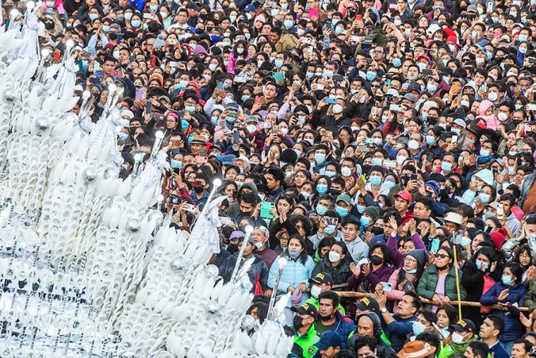 ¡Avanza, oe!, pitazos, órdenes, el griterío es un vigorizante poderoso para los cargadores, mejor que la maca. Cuando el Señor de la Resurrección sale, tañen largamente las campanas de la catedral. Lo reciben una lluvia de pétalos de rosa, una corona de drones y los bombazos de los fuegos artificiales.