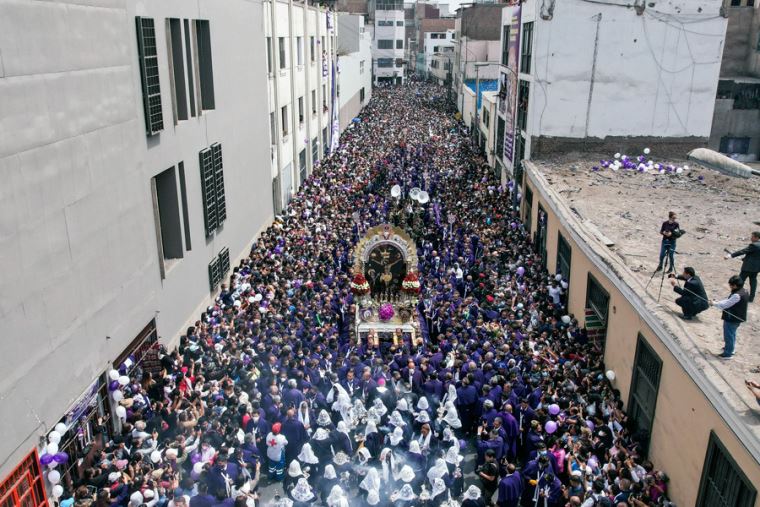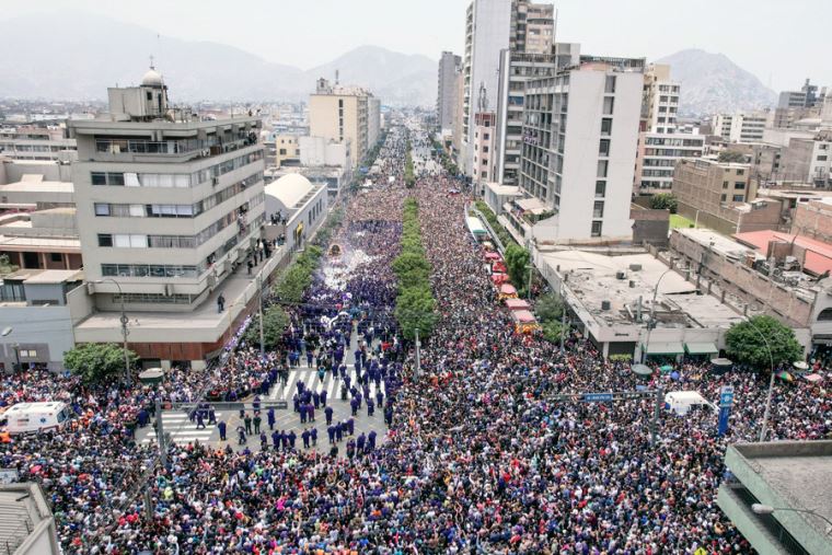 La avenida Emancipación, abarrotada de fieles, lucía un atenuado color morado debido a la gran cantidad de fieles que volvieron a vestir el tradicional hábito, que identifica la devoción por el Cristo de Pachacamilla.