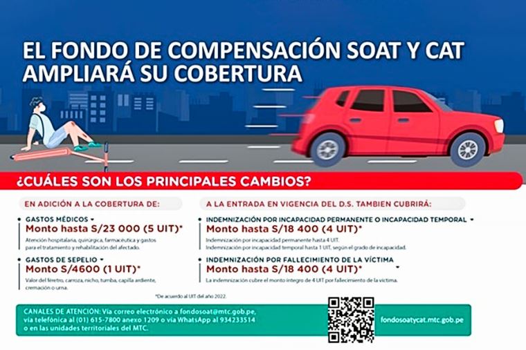El ministro Tineo añadió que las coberturas de indemnizaciones se atenderán de la siguiente manera respecto a los accidentes ocurridos a partir del 19 de noviembre de este año: Indemnización por fallecimiento de la víctima: Íntegro 4 UIT (S/18,400, año 2022). Indemnización por invalidez permanente: Hasta 4 UIT (S/18,400 año 2022). Indemnización por incapacidad temporal: Hasta 1 UIT (S/4,600 año 2022)