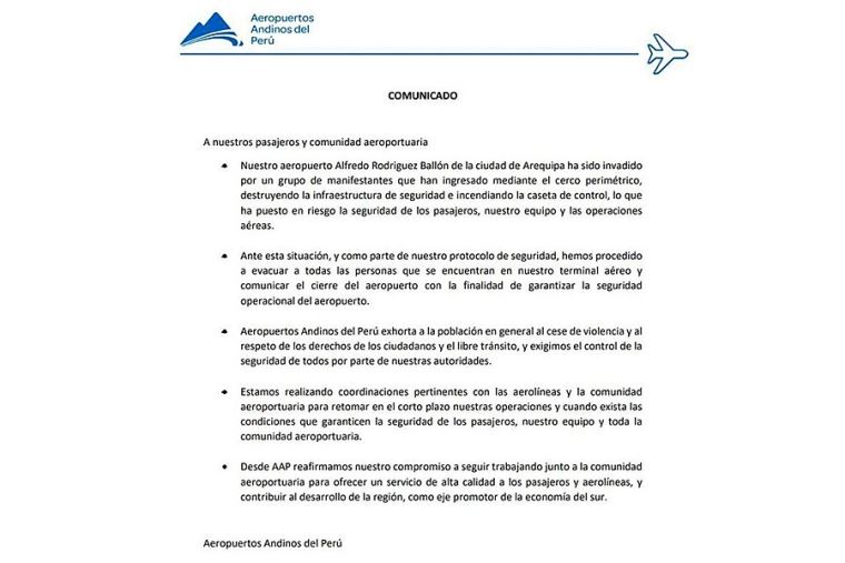 “Tomar instalaciones públicas o privadas constituye un delito, hacemos un llamado a la calma ante los hechos que se vienen registrando en el aeropuerto de #Arequipa; pedimos respeto y tranquilidad a la población que hace uso de su derecho a protestar”, escribió la PNP en sus redes sociales.