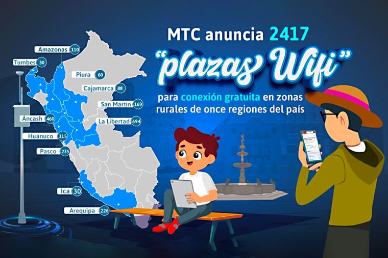 Las “plazas WiFi” se proyectan en las regiones de Ica (30), Amazonas (110), Huánuco (315), Pasco (235), Áncash (460), Arequipa (226) La Libertad (694), San Martín (169), Tumbes (30), Piura (60), y Cajamarca (88). En total, serán 2417.