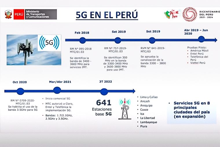 Si bien en el Perú se brindan servicios 5G, el objetivo es potenciar su uso mediante el aprovechamiento del espectro radioeléctrico en la banda de 3.5 GHz. A principios del 2022 se habían implementado 43 estaciones base 5G, y para fines del tercer trimestre del mismo año se contaba con 641 estaciones en ocho ciudades del país (Lima y Callao, Áncash, Arequipa, Cusco, Ica, La Libertad, Lambayeque y Piura).