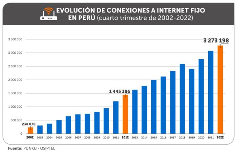 De acuerdo con el portal informático PUNKU, en el año 2012 las conexiones de internet fijo sumaban 1 445 386 y al cierre del año 2022 dichas conexiones ascendieron a 3 273 198; así, en diez años, las conexiones de internet fijo se más que duplicaron, registrando un incremento de 126.46 %.