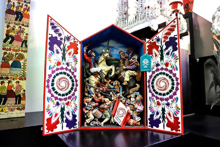 Retablo ayacuchano: Artesanía de la línea imaginería que escenifica tradiciones y expresa la algarabía de la gente en las diversas festividades regionales. Se ha hecho a mano, a base de harina de papa y yeso cerámico.