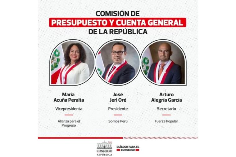 Por otro lado, en la Comisión de Presupuesto y Cuenta General de la República, fue elegido como presidente el congresista José Jerí (SP). En la vicepresidencia se designó a María Acuña (APP) y en la secretaría a Arturo Alegría (FP).