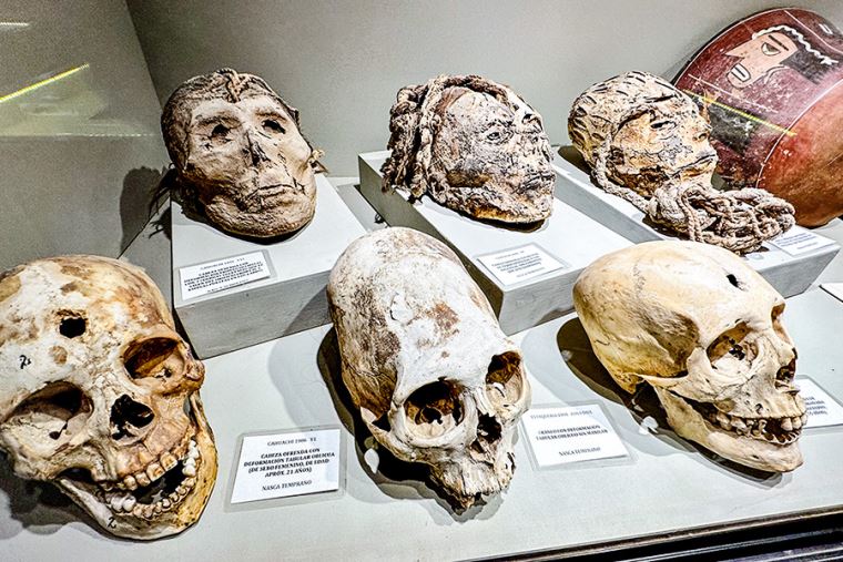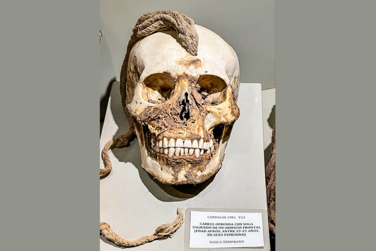 Cahuachi también fue espacio de sacrificios. Se exhibe parte de las cabezas y ofrendas encontradas en el sitio arqueológico, también presentes en la iconografía de los cerámicos. Se trata de cabezas de hombres, mujeres y niños. Solo una vez se encontró el cuerpo mutilado junto a la cabeza.
