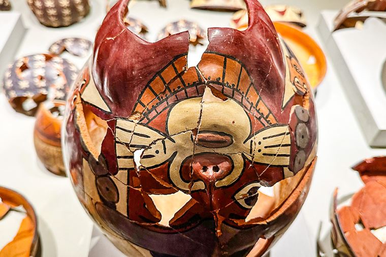 Como ofrendas a la divinidad, todas las cerámicas de Cahuachi han sido rotas adrede. Las piezas de uno de los cerámicos que hay en vitrina fueron desperdigadas en una extensión muy grande de una plaza del centro ceremonial. Los arqueólogos unieron las piezas de este singular rompecabezas precolombino, en un largo proceso, que tomó muchas horas, solo con fines didácticos para el público.