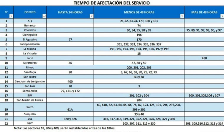 La ministra de Vivienda, Construcción y Saneamiento, Hania Pérez de Cuéllar, informó que el servicio de agua potable en el 14% de los sectores afectados verán el restablecimiento del agua en un plazo de hasta 24 horas, mientras que en el 68% de los casos el servicio será restablecido en 48 horas. Para el 18% restante de las jurisdicciones más afectadas, como Villa El Salvador, San Juan de Miraflores, la parte alta de Chorrillos y Villa María del Triunfo, se espera que el servicio vuelva en un máximo de 96 horas, es decir, hasta el 10 de octubre.