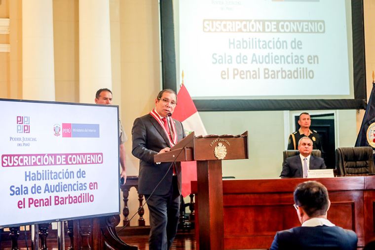Durante la firma de este convenio con el ministro del Interior, Vicente Romero, el titular del Poder Judicial dijo que "nuestro país tiene varios expresidentes juzgados por delitos de corrupción, por lo que resulta vital contar con instalaciones adecuadas que permitan sus respectivos juzgamientos y acceder al proceso conociendo de cerca el desarrollo del mismo".