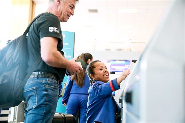 Se desempeña en “atención al pasajero”, les ayuda a hacer el chek-in, en el etiquetado de las maletas. Y siempre lo hace con la mejor predisposición y amplia sonrisa.