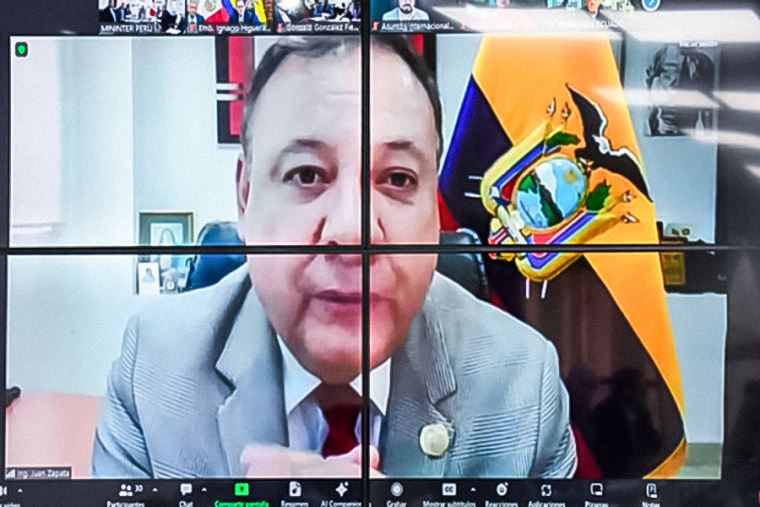Acompañaron al ministro del Interior en esta reunión virtual, organizada por el Gobierno de Ecuador, el viceministro de Orden Interno, Miguel Núñez, el jefe del Gabinete de Asesores, Jaime Reyes, y el superintendente nacional de Migraciones, Armando García.