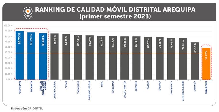 En el otro extremo, Miraflores obtuvo el desempeño más bajo en el indicador general, con 59.22 %, (38.08 % en el indicador de voz y 73.31 % datos). Sabandia (68.50 %), Alto Selva Alegre (77.81 %), Paucarpata (78.05 %) y Sachaca (79.90 %) fueron otros distritos que presentaron menores niveles en el indicador de calidad móvil distrital.