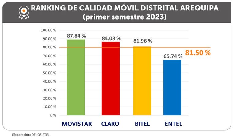 Tras el procesamiento de información también se verificó que, con respecto al promedio ponderado por tráfico a nivel de los distritos de la provincia de Arequipa, Movistar alcanzó el índice de calidad móvil más alto de las cuatro empresas operadoras, con 87.84 %. Le siguieron Claro (84.08 %), Bitel (81.96 %) y Entel (65.74 %). De esta manera, el promedio general de las operadoras llegó a 81.50 %, lo que significó un retroceso de 2.6 % respecto al mismo periodo de 2022 (84.10 %).
