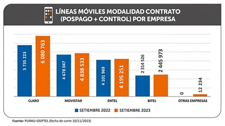 De acuerdo a la información publicada en el portal Punku del Osiptel, este crecimiento es resultado del avance en la cantidad de líneas móviles de la modalidad contrato de las principales empresas operadoras. Claro reportó 6.02% más líneas que setiembre de 2022. En tanto, las líneas de Bitel en esta modalidad crecieron en 5.68%; las de Movistar, en 3.43%; y las de Entel, en 2.27% en el mismo periodo.
