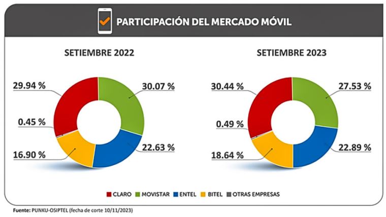 En dicho periodo, Claro se mantiene como líder del mercado móvil con una participación de 30.44%, y con una diferencia de casi tres puntos porcentuales por encima de Movistar, la cual registró el 27.53% de participación. Entel y Bitel cierran el trimestre con una participación de 22.89% y 18.64%, respectivamente.