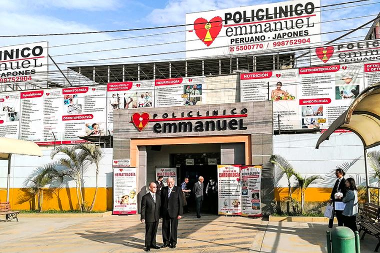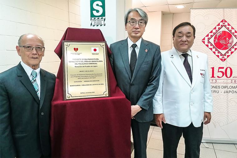 El embajador de Japón, Tsuyoshi Yamamoto, acompañado por Federico Nakashi, y el director del policlínico Enmanuel, Jaime Sakaino.