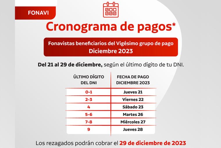 Si eres beneficiario del Vigésimo Grupo de Pago - diciembre 2023, podrás acercarte con tu DNI a las agencias del Banco de la Nación a partir del 21 de diciembre, de acuerdo al cronograma de pagos.